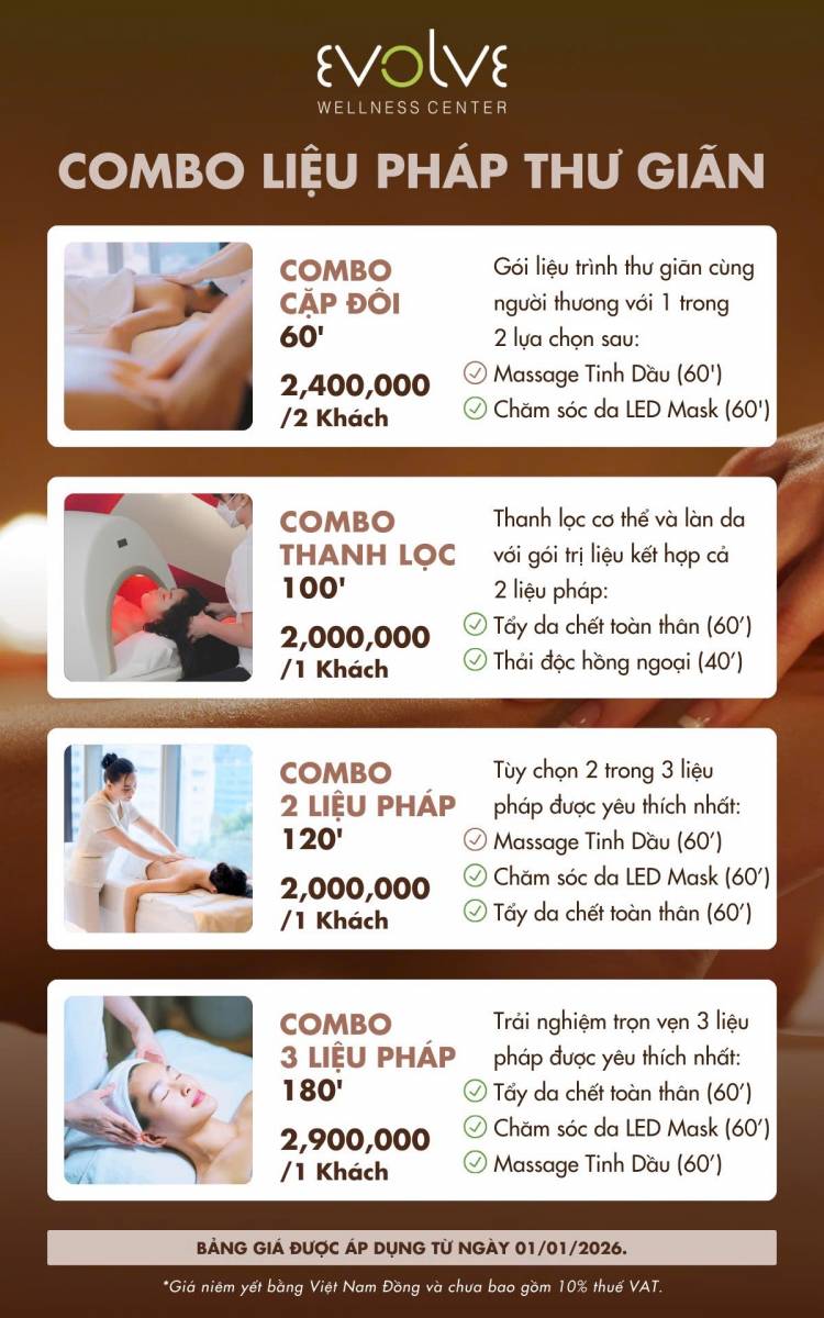 Tận hưởng hành trình thư giãn độc quyền tại Evolve Wellness Center, nơi cơ thể tìm lại nhịp thở an yên giữa lòng thành phố. Mỗi liệu trình được chăm chút tỉ mỉ để mang lại cảm giác thư thái và tái tạo toàn diện, giúp bạn nuôi dưỡng sự cân bằng từ sâu bên trong.